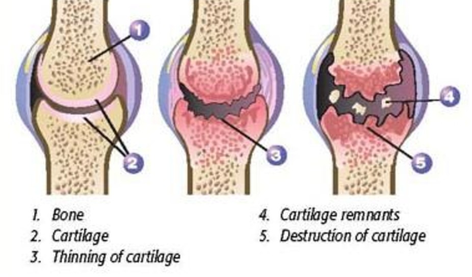 Causes include previous joint injury, abnormal joint or limb development, obesity and inherited factors. Risk is greater also in those individuals who have jobs that result in high levels of joint stress or in case of deskbound jobs. Osteoarthritis is believed to be caused by mechanical stresson the joints and low-grade inflammatory processes.It develops, as cartilage is lost with eventually the underlying bone becoming affected.As pain may make it difficult to exercise, muscle loss may occur. Various symptoms are experienced by a patient of osteoarthritis;